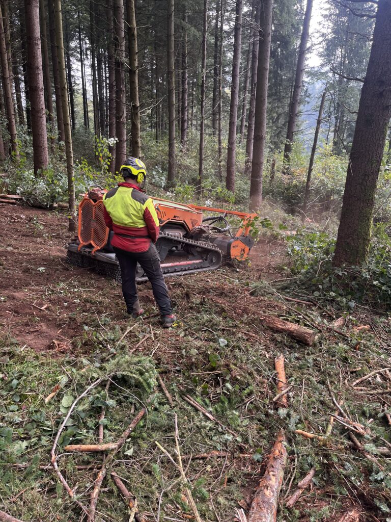 Mit unserer ferngesteuerten MDB LV 800 Mulchraupe mulchen wir Flächen präzise und bodenschonend – ohne die vorhandene Naturverjüngung oder den Waldboden zu beeinträchtigen.